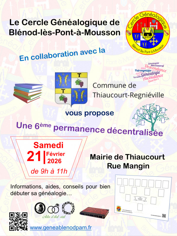 L'opération de commande groupée d'arbre généalogique "GénéraMax" a connu un énorme succès (30 arbres commandés). Face à de nouvelles demandes, le Cercle Généalogique de Blénod-lès-Pont-à-Mousson lance une nouvelle réservation avant une commande en mars. Date limite le 3 mars 2026. Le...